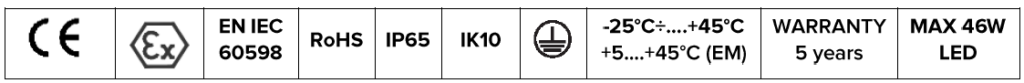 The lighting fixture is manufactured in accordance with the requirements of standards SR EN 60079-0, SR EN 60079-31, SR EN 60598-1.